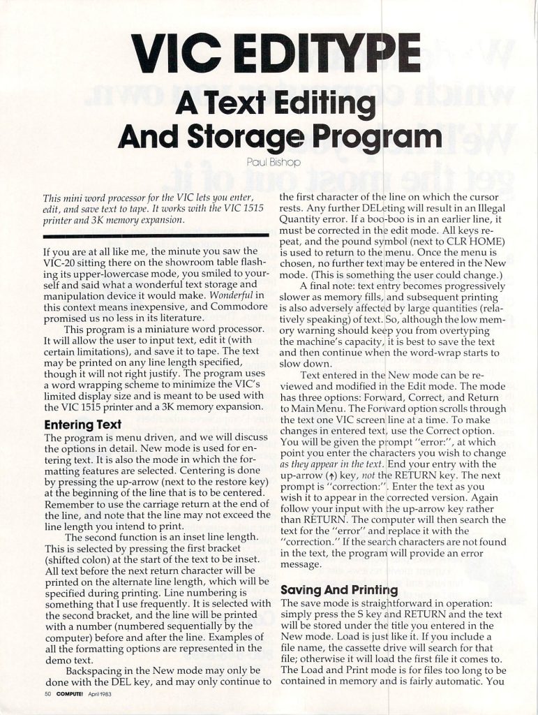 This program is a miniature word processor. It will allow the user to input text, edit it (with certain limitations), and save it to tape. The text may be printed on any line length specified, though it will not right justify. The program uses a word wrapping scheme to minimize the VIC’s limited display size and is meant to be used with the VIC 1515 printer and a 3K memory expansion.
