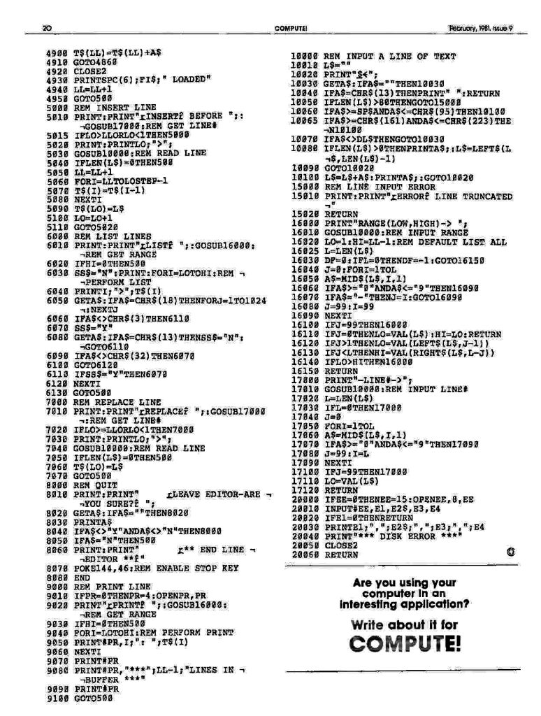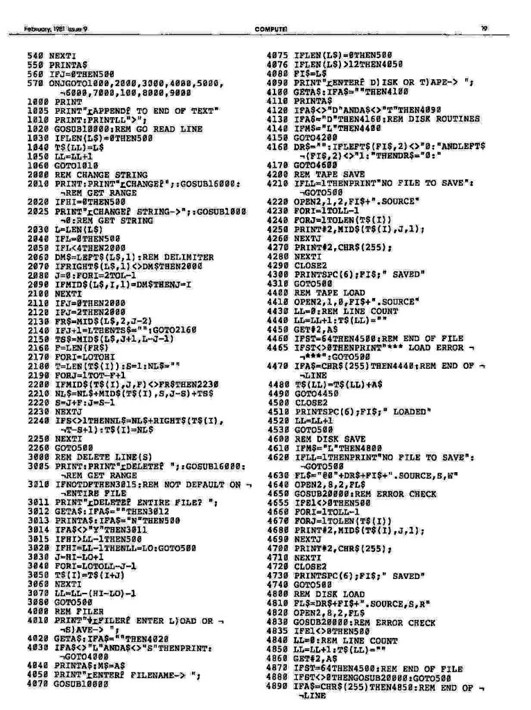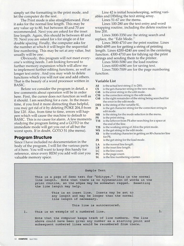 Primary variables are: CL – the pointer to the top line (from 0-#lines) of the screen; X – the horizontal position of the cursor 2-39; Y – the vertical position of the cursor on the screen, 1-23; TXS – the string that contains all the text and is organized in 38 character substrings, one for each line; T$ and T – “temporary variables”; A – usually a keystroke typed; SCR – the address of the screen memory origin; NL – number of defined lines; FRL – the starting line in text of the defined lines; RL – the starting line in TX$ for reserved lines (the buffer). Several constants are QO, Ql, Q23- which return 0, 1, or 23 (saves memory); L2 = 38; L = 40; B$ is 38 null (CHR$(0)) characters.