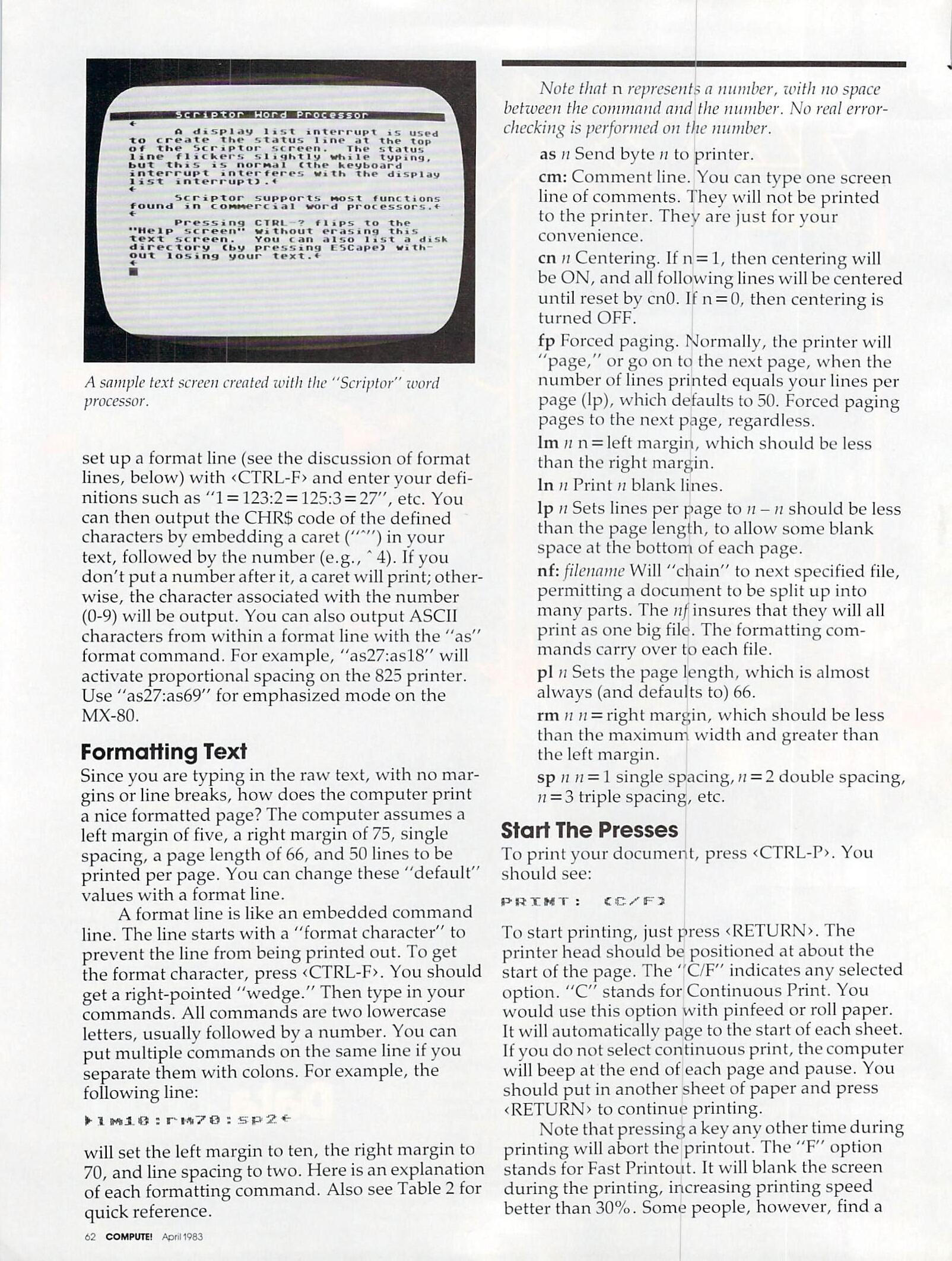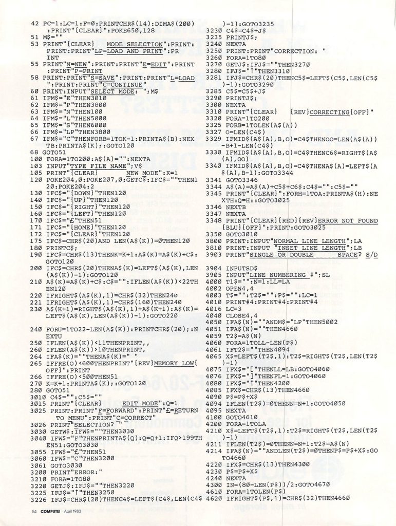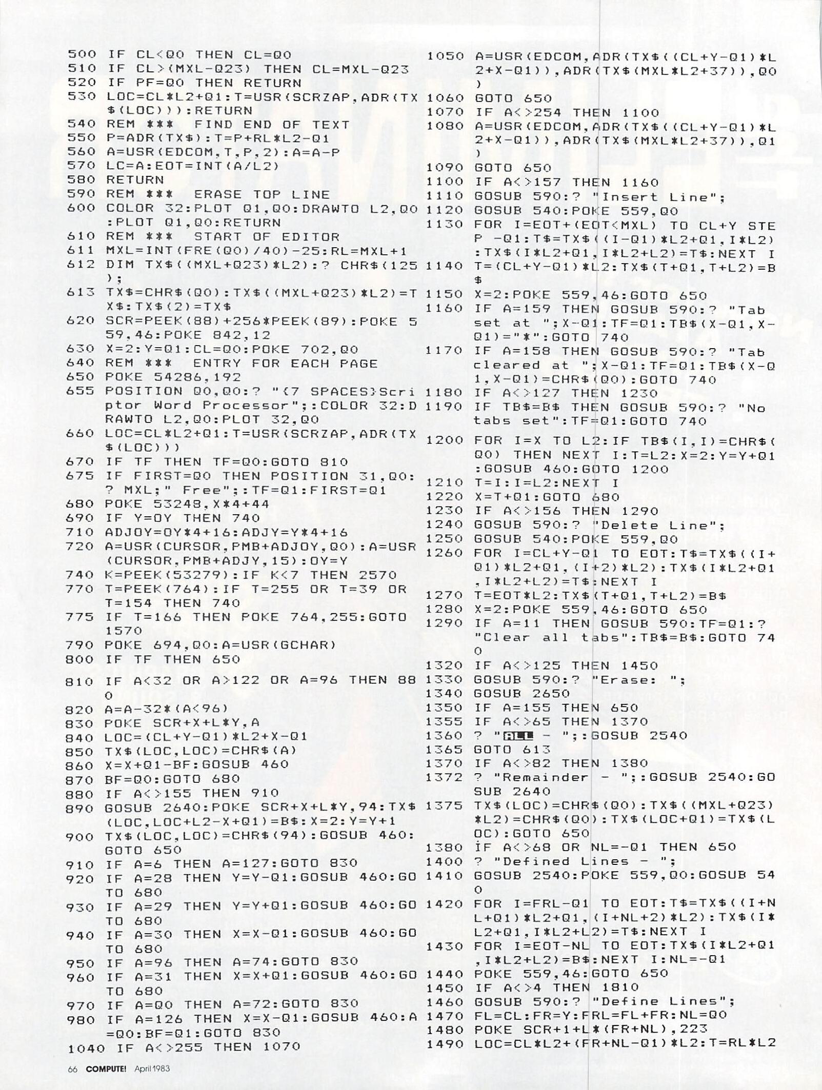 “Scriptor,” the word processor program at the end of this article, has many features usually found only in professional word processors, but it lacks a few features such as search and replace, justification, data base merge, etc. Also, it is written in BASIC, so it can be rather slow at times. It is, however, aided by several machine language subroutines for time-critical situations such as disk input/output and some editing features.