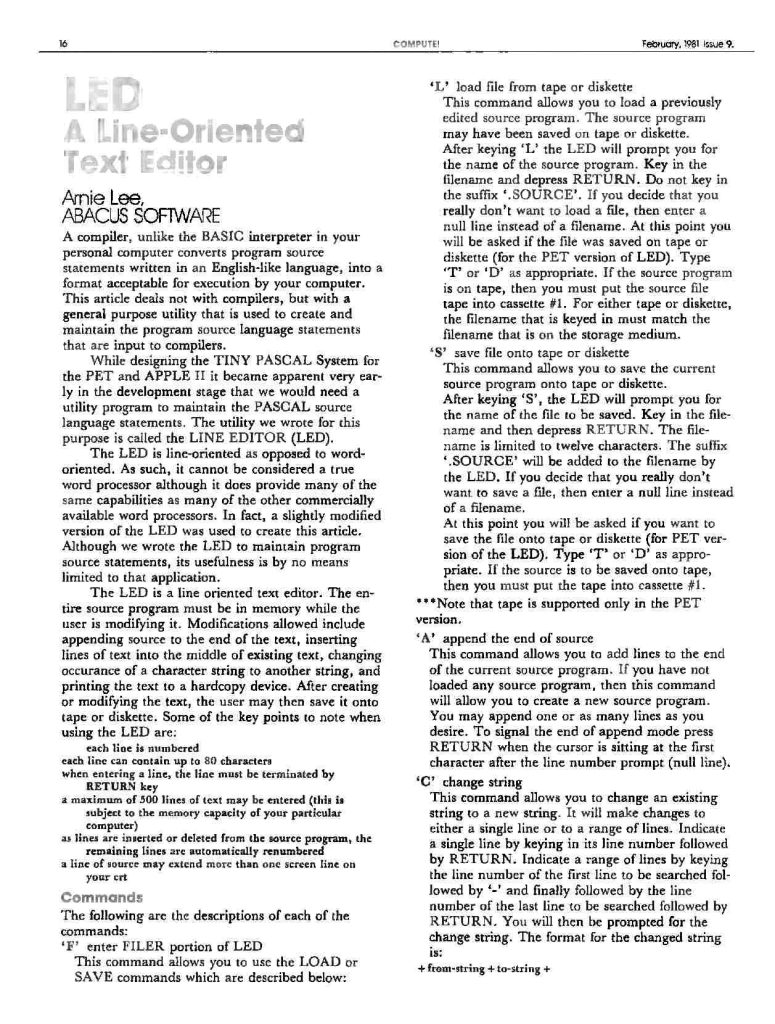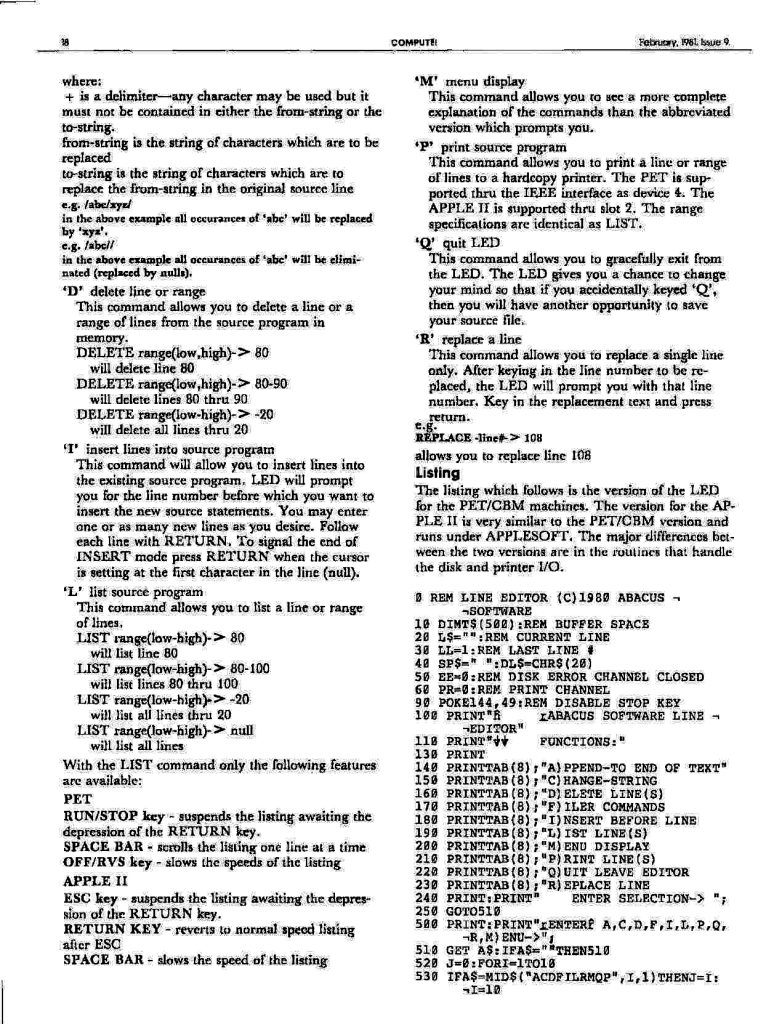 The listing which follows is the version of the LED for the PET/CBM machines. The version for the APPLE II is very similar to the PET/CBM version and runs under APPLESOFT. The major differences between the two versions are in the routines that handle the disk and printer I/O.