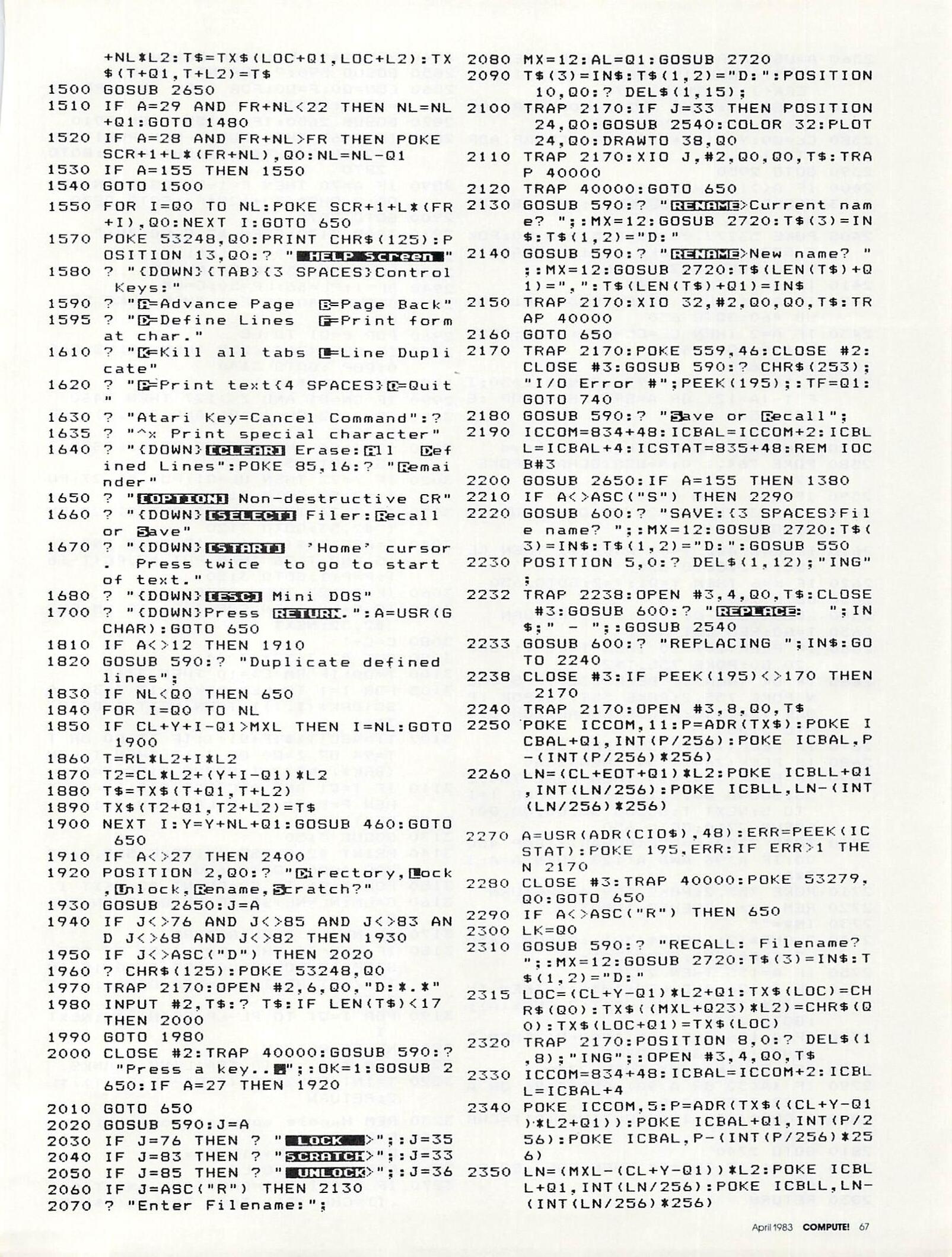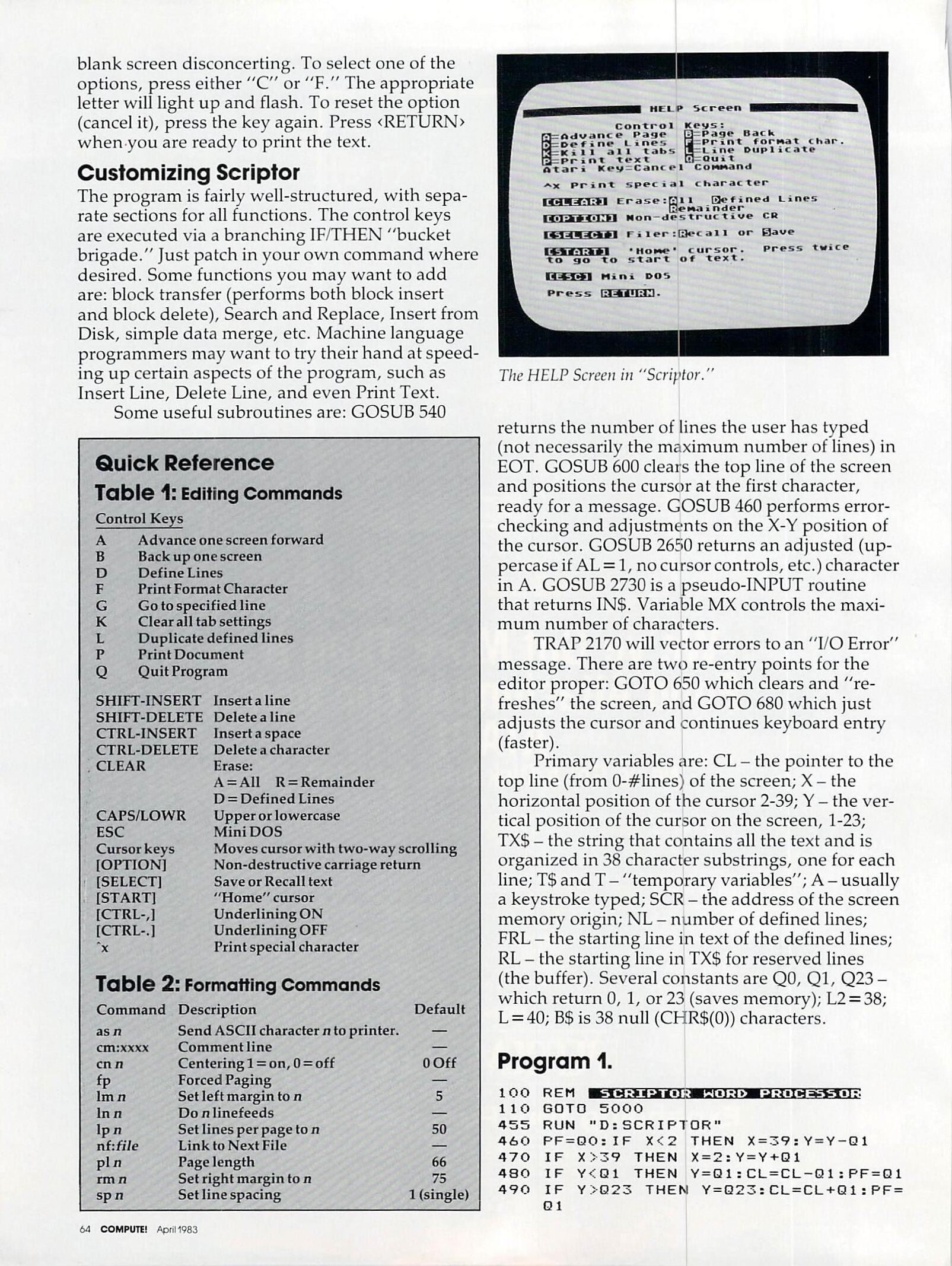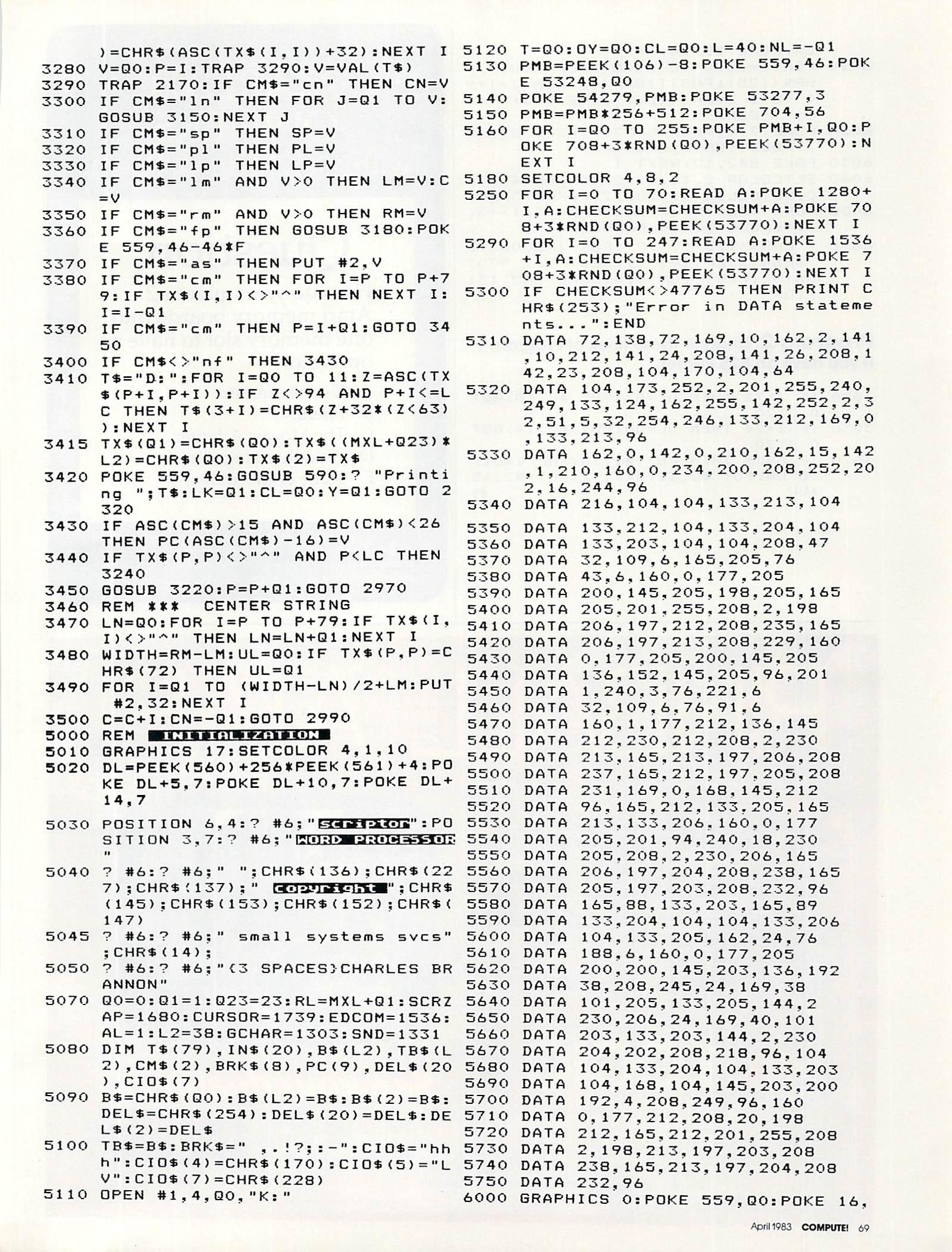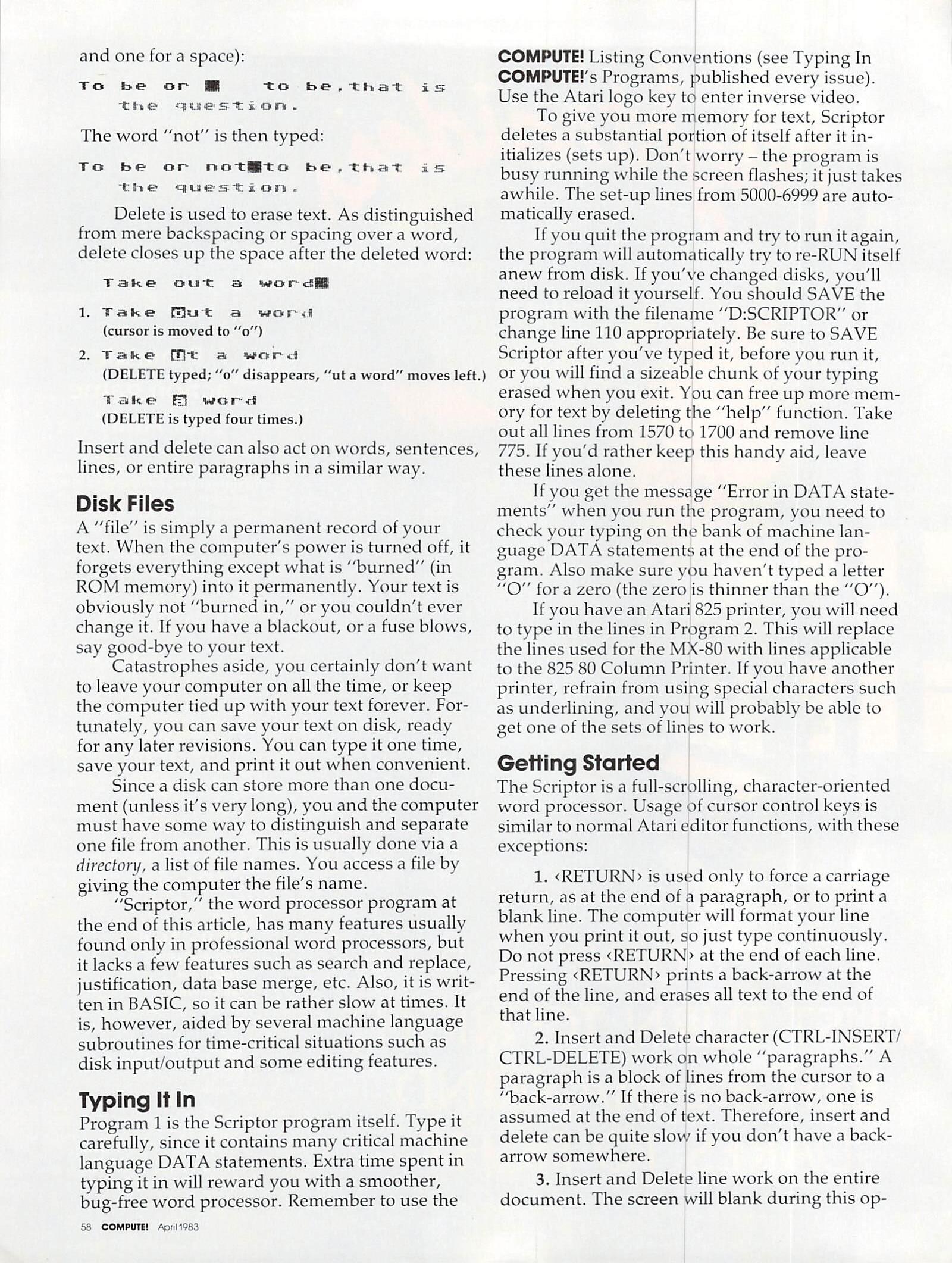 Program 1 is the Scriptor program itself. Type it carefully, since it contains many critical machine language DATA statements. Extra time spent in typing it in will reward you with a smoother, bug-free word processor. Remember to use the COMPUTE! Listing Conventions (see Typing In COMPUTE’s Programs, published every issue). Use the Atari logo key to enter inverse video.