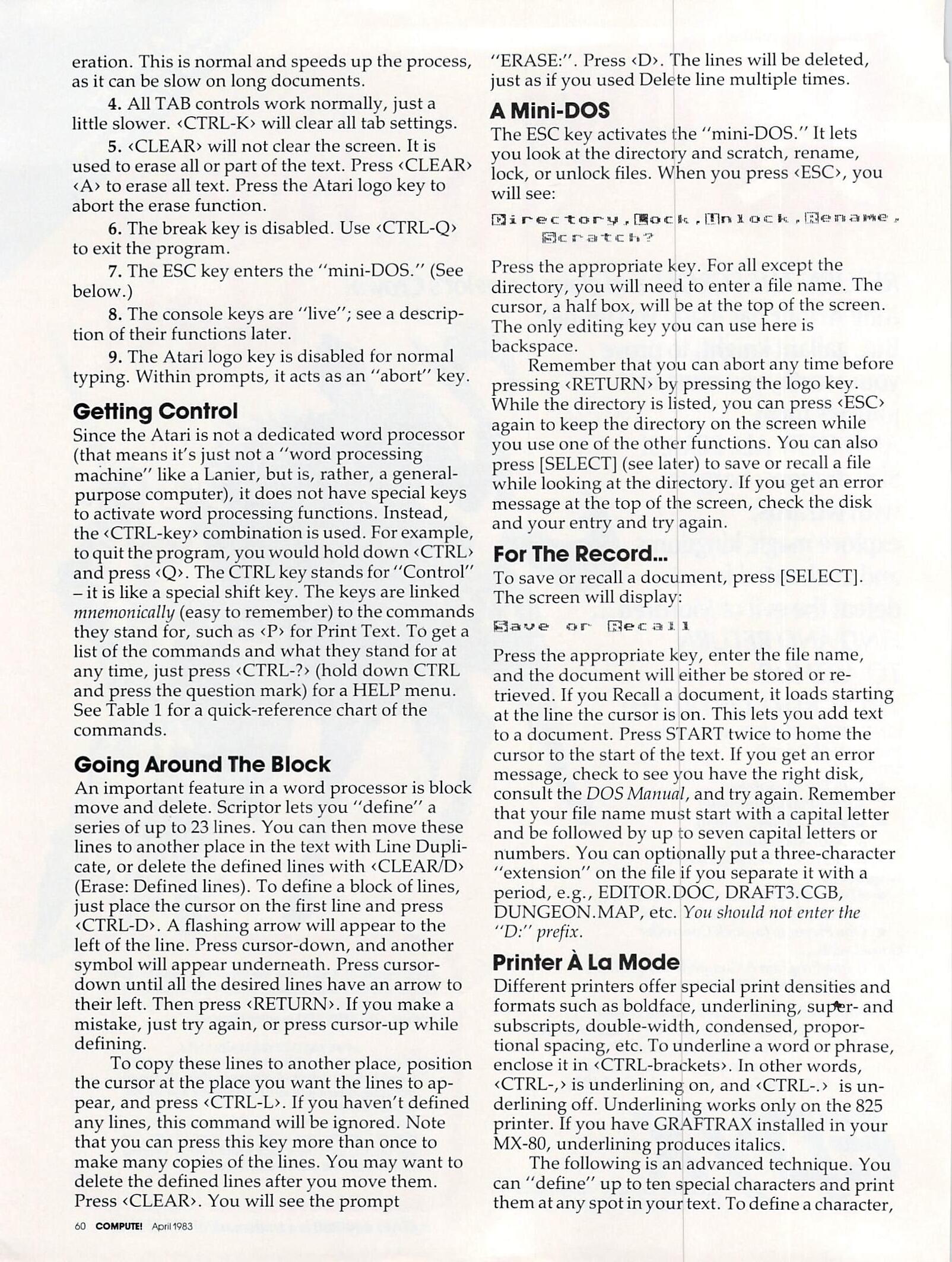 The Scriptor is a full-scrolling, character-oriented word processor. Usage of cursor control keys is similar to normal Atari editor functions, with these exceptions: