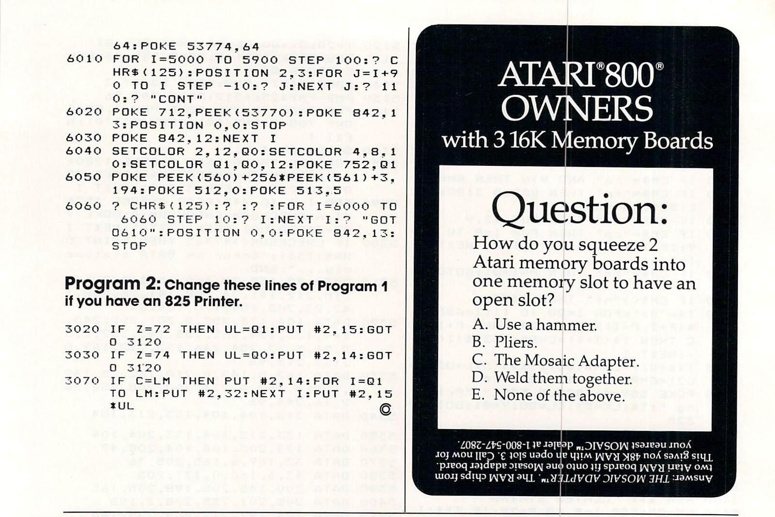 If you have an Atari 825 printer, you will need to type in the lines in Program 2. This will replace the lines used for the MX-80 with lines applicable to the 825 80 Column Printer. If you have another printer, refrain from using special characters such as underlining, and you will probably be able to get one of the sets of lines to work.